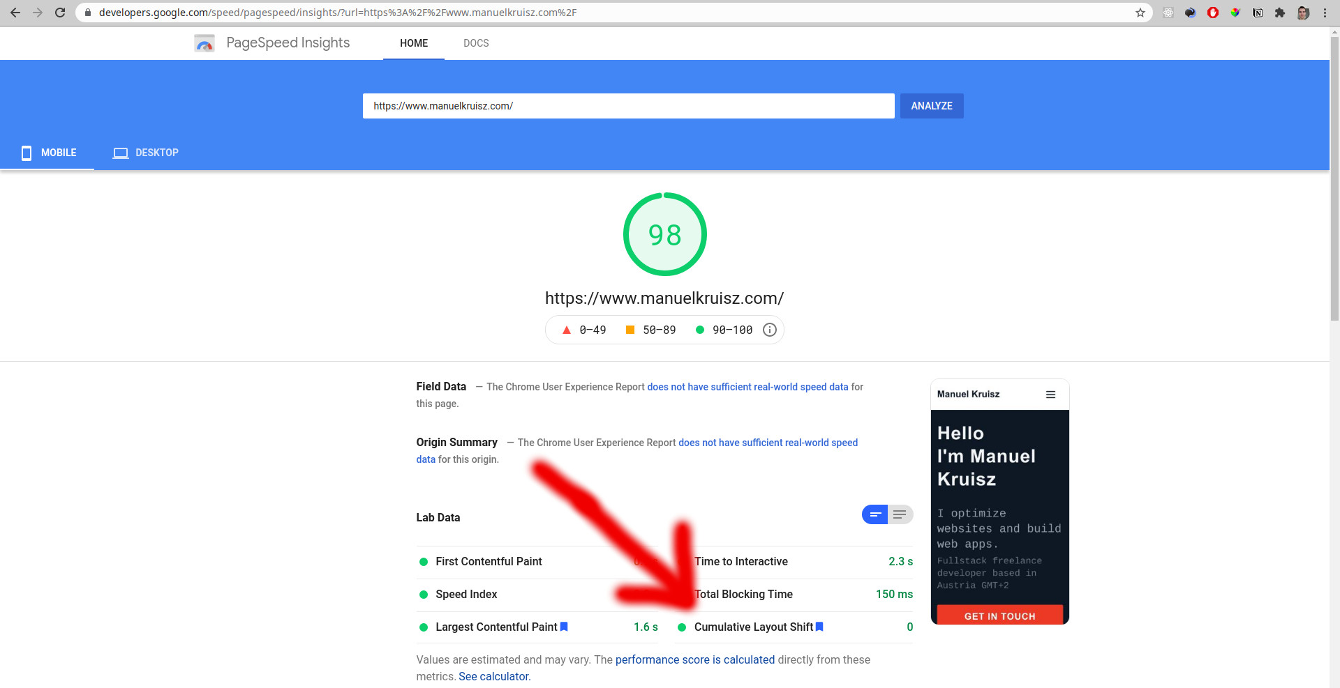 For us, this means that we want this score to be as low as possible, and typically, depending on how our website is built, it should be possible to reach the perfect score of 0.